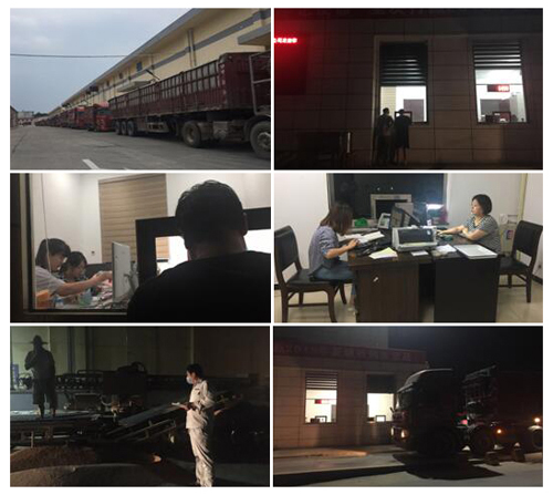 6月26日,我们开设三条线进行卸载,至19点已卸载32辆车,入库小麦820吨,此时进粮车还源源不断的开进库里等待卸载。天气预报我公司所处华州区6月27日凌晨将有大到暴雨,公司领导商议后决定要做到减损失、不压车、服务好,将剩余车辆全部卸完。为坚决完成卸载任务,储运科的同志们想方设法加快卸载速度,质检、司磅、监仓、结算付款各司其职,交粮车辆有序停放,收购现场忙而不乱,卸粮工作紧张而快速。