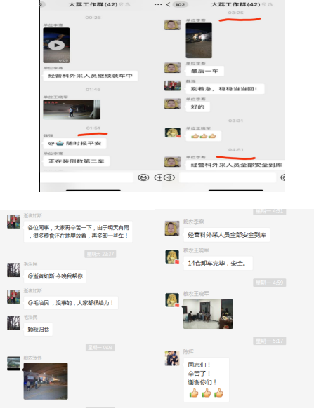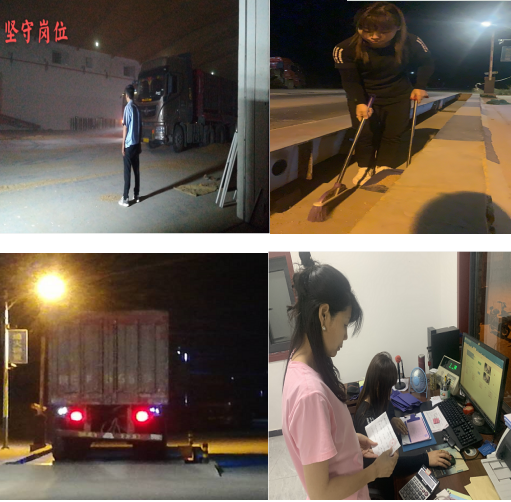 库区内:凌晨1点的大荔库区灯火通明。门卫逐车登记、按序发放通行证;质检人员扦样出报告;司磅人员毛重、皮重、净重认真计量一丝不苟;8号仓、14号仓、1号棚仓、2号棚仓所有仓管员坚守岗位确保卸车安全正常;财务科对票转账,坚决不打白条,第一时间把粮款交到群众手里;后勤处的办公人员,深夜给一线人员送来食物、热水。整个收购现场忙而不乱,交粮车辆有序停放,卸粮工作紧张而快速;在这忙碌中,不知不觉已经卸粮97车,入库小麦3923吨创造了公司成立以来入库量最高的单日记录!没有一个人知道,此刻日历上已经显示此时是6月8日了……