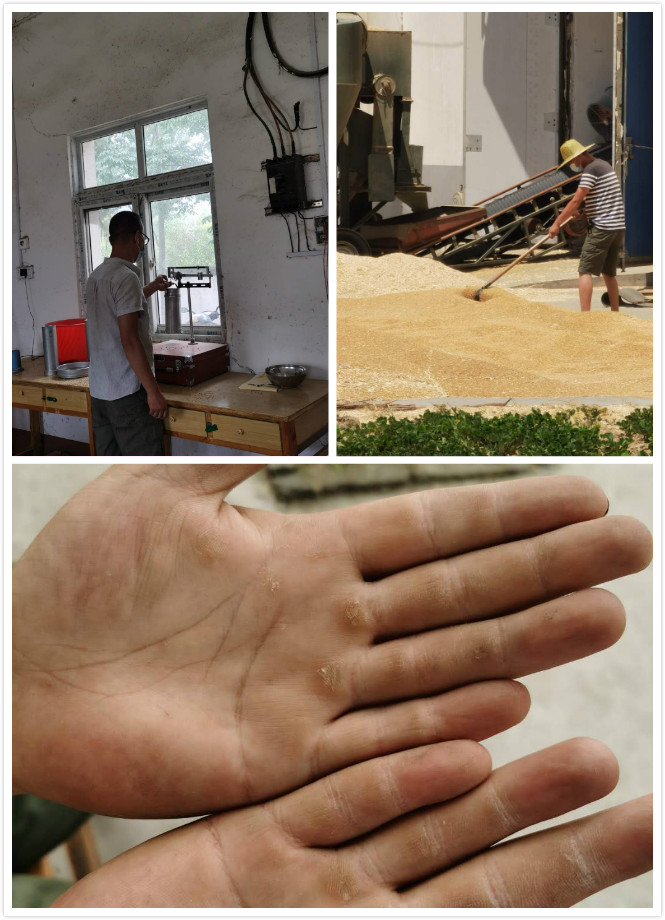 负责扦样和检验的宁家声和徐胜武两位同志,在没有自动扦样器的情况下,使用粮探子扦样。到库的每一车粮他们都需顶着烈日爬上粮车扦样,时常都是扦完一两车之后衣服已湿透,而粮探子留给这两位壮硕结实青年的却是厚厚的老茧和满手血泡,依然毫无怨言。他们同时还要肩负检验工作,对所有入库车辆逐车化验,加班加点严格执行标准,做到了每车必检,严把粮食入仓质量关。