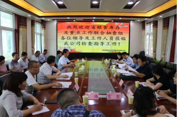 2020年6月23日,陕西省粮食和物资储备局张翔副局长带队,由陕西省粮食和物资储备局粮安考核处副处长康省、办公室副主任张少祥、执法督查处胡澜,国家粮食和物资储备局陕西局、省农发行、省粮油质检中心、省储备粮系统等部门和单位11人组成的2020年陕西省省级粮食库存及重点工作第一联合抽查组莅临扶风库公司开展检查工作。宝鸡市发改委负责粮食工作的郝斌调研员、宝鸡市粮油质检中心李金堂主任、扶风县粮食局局长侯宁刚,陕储粮集团纪委书记郭建刚、扶风库公司总经理王晓勇、副总经理吴新强、张娟丽及相关科室负责人陪同检查。